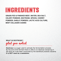 INGREDIENTS: 100% Grass-fed & Finished Beef, water, sea salt, celery powder, dextrose (not used as a sweetener, initiates and is eliminated in the fermentation process), spices, cherry powder, garlic powder, lactic acid culture, in natural collagen casing.